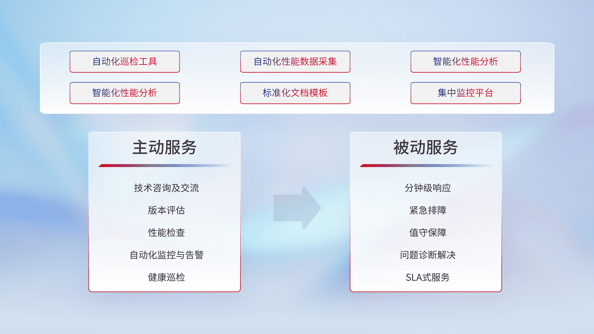智能化工具和标准化文档,,,保障服务质量,,,提供主动服务(包含技术咨询、、、、版本评估、、、、性能检查、、自动化监控与告警、、、、健康巡检)和被动服务包含(分钟级响应、、、、紧急排障、、、、值守保障、、、问题诊断解决、、、SLA服务)。。。